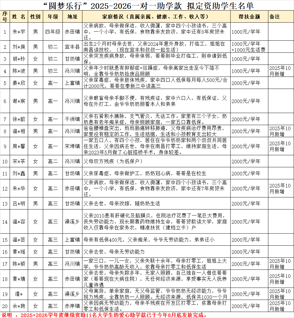 公示|“圆梦乐行”2025-2026一对一助学款拟定资助学生名单