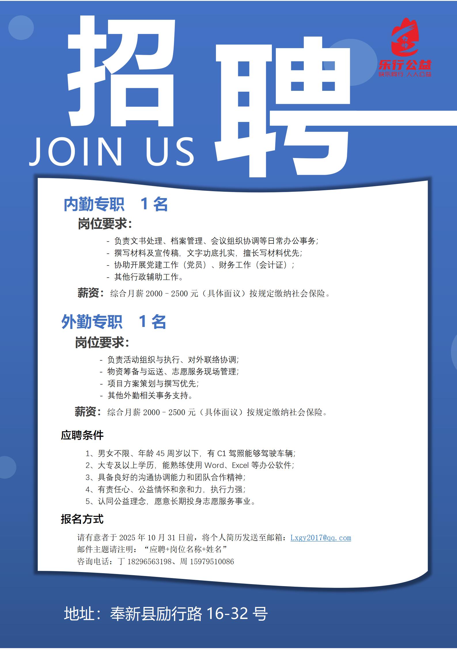 根据慈善组织相关规定,因工作需要配备专职工作人员,奉新县乐行公益联合会现面向社会公开招聘专职工作人员2名,具体如下: