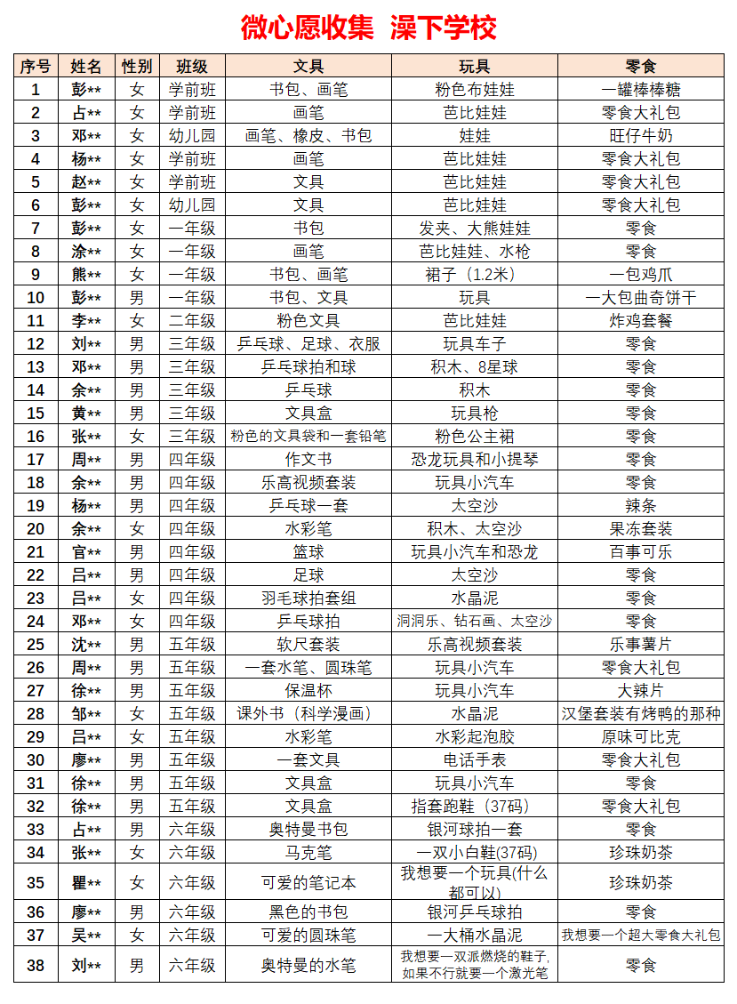 今天,我们带来澡下学校38个具体到姓名、班级、心愿清单的期待。